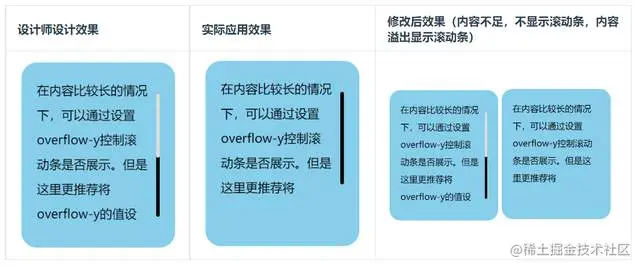 在内容比较长的情况下,可以通过设置 overflow-y控制滚动条是否展示。但是这里更推荐将overflow-y的值设置为 auto。如果你将overflow-y显式设置为 scroll时,不管容器内容长短,滚动条都会展示出来,这种体验是不好的