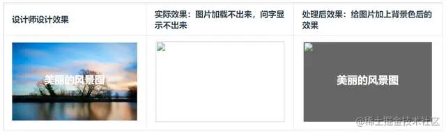这个效果大家只需做个了解就好。通常如果图片上有文字,设计师在设计效果图时都会在图片和文字中间加上一层黑色的半透明遮罩层,这样即使图片加载不出来,也不影响文字的展示效果。