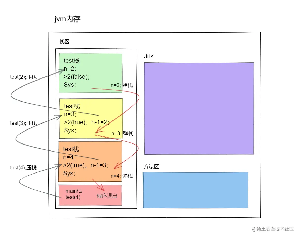 - 在递归调用的过程当中系统为每一层的返回点、局部量等开辟了栈来存储。