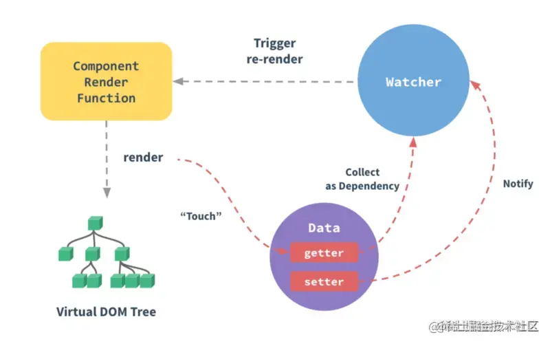 当一个Vue实例创建时,Vue会遍历data中的属性,用 Object.defineProperty(vue3.0使用proxy )将它们转为 getter/setter,并且在内部追踪相关依赖,在属性被访问和修改时通知变化。 每个组件实例都有相应的 watcher 程序实例,它会在组件渲染的过程中把属性记录为依赖,之后当依赖项的setter被调用时,会通知watcher重新计算,从而致使它关联的组件得以更新。