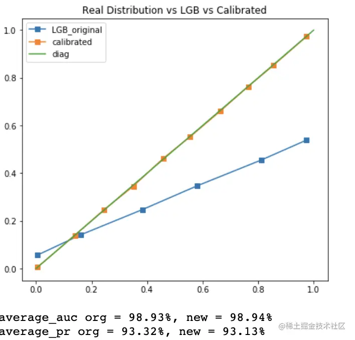 让我们对预测概率再做一层处理,黄线可以简单理解为我们对LGB的预测结果做了一层映射 ,这时校准后的预测概率和真实概率基本一致了。但是有趣的是校准后的预测概率AUC = 98.94%和原始预测基本没差别?!