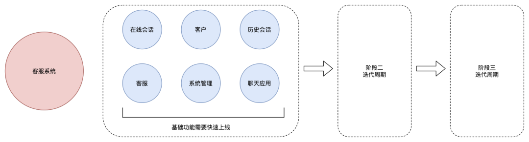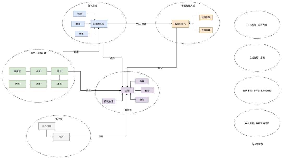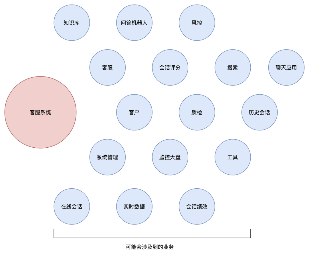 在客服系统中,重要的一个概念是会话(session),会话id(sessionId)将会是一个非常重要的设计。一个会话包含了一个完整的客户咨询:用户发起会话,智能机器人问答,人工客服介入,知识库内容的选取,会话评分,会话标签等等。在不同的域中,我们要抽象一个核心的主线出来,在客服系统中,这个主线便是会话id。另外,我们需要明确现阶段我们的目标是什么,以及未来我们的产品的扩展能力(未来要做的),在我们的领域模型中去验证。在加入新的模型后,我们需要验证:- 是否影响到了现有的域,是否让现有的域变得不稳定甚至有大的重构?