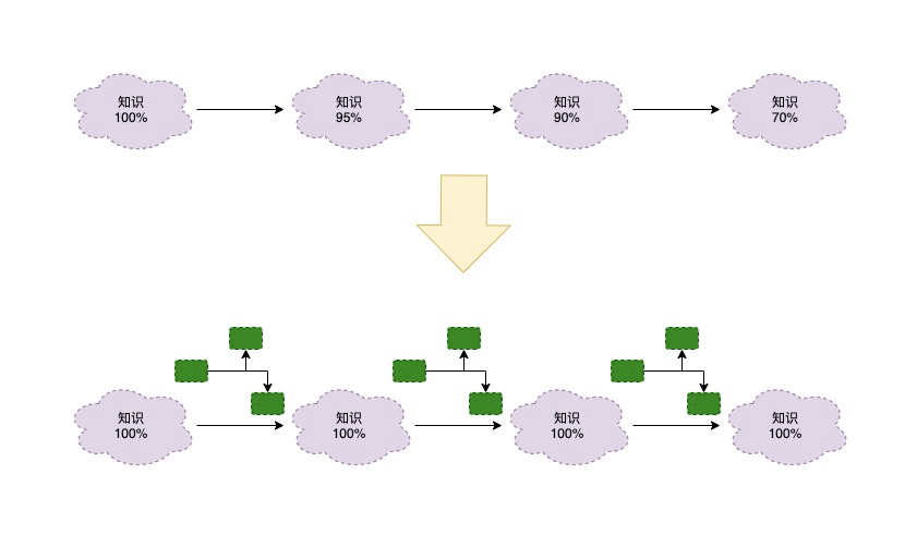 在《领域驱动设计》一书中,作者 Eric Evans 讲过:在项目的最初阶段,需要业务,产品和技术同时参与进来。尽可能用 UML 建模语言把业务含义和产品功能描述清楚,让知识传递。这里的 UML(模型)语言可能有很多种,有产品视角的,有开发视角的,也有测试视角的。在公司中,每个团队往往是各司其职,很多人只会接收「他的上游」给他的知识,却忽略了更上游的知识。在这种情况下,知识的传递可能会出现不完整,甚至是断层。这种糟糕的情况发生后,下面的开发人员往往会按照自己的「经验」来办事,认为他们做的是合理的。这种做法的最终结果可能就是把豪华邮轮变成了一艘快艇。![]()