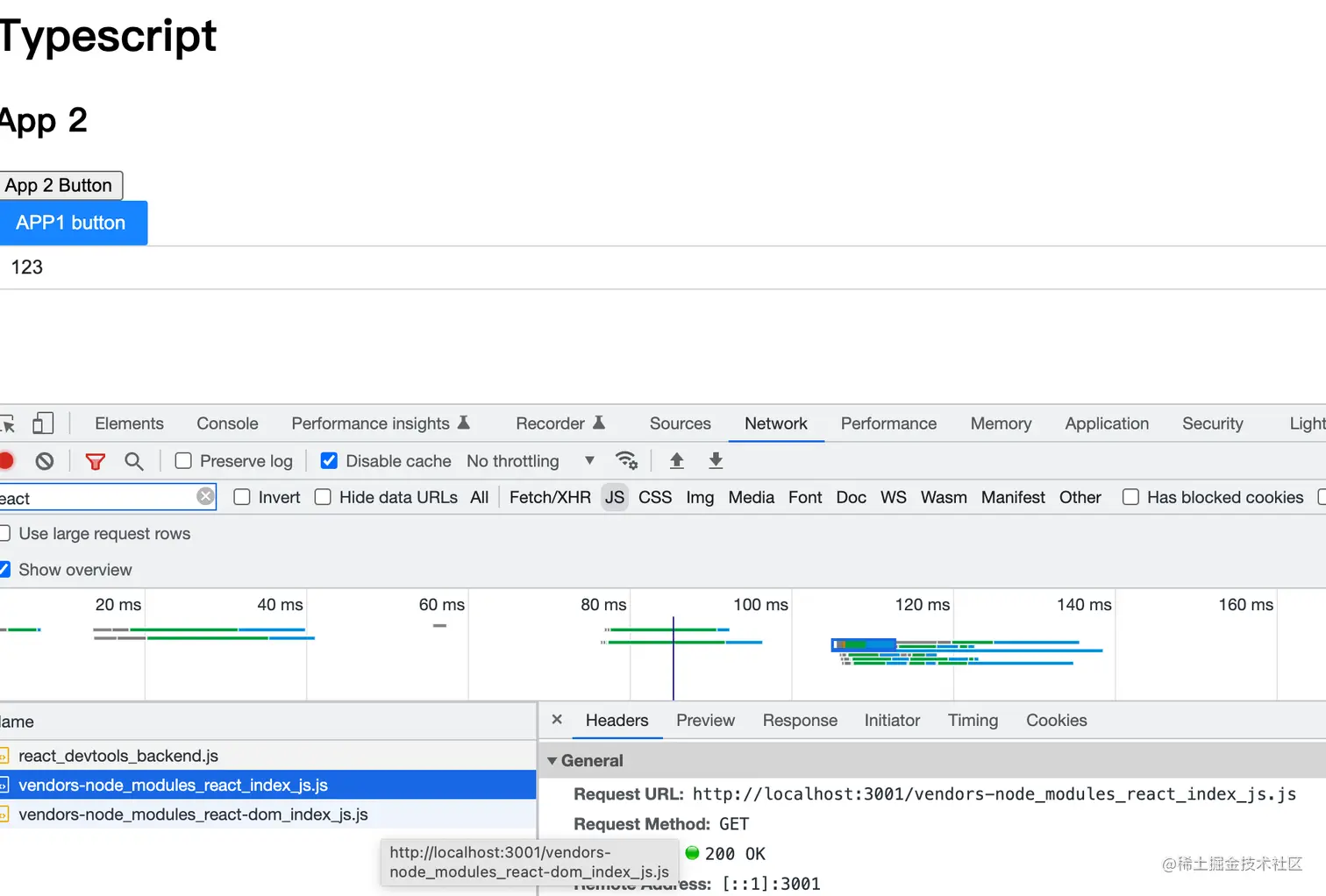 发现 app1 和 app2 的 react 和 react-dom 资源都是加载 app1 构建的产物。