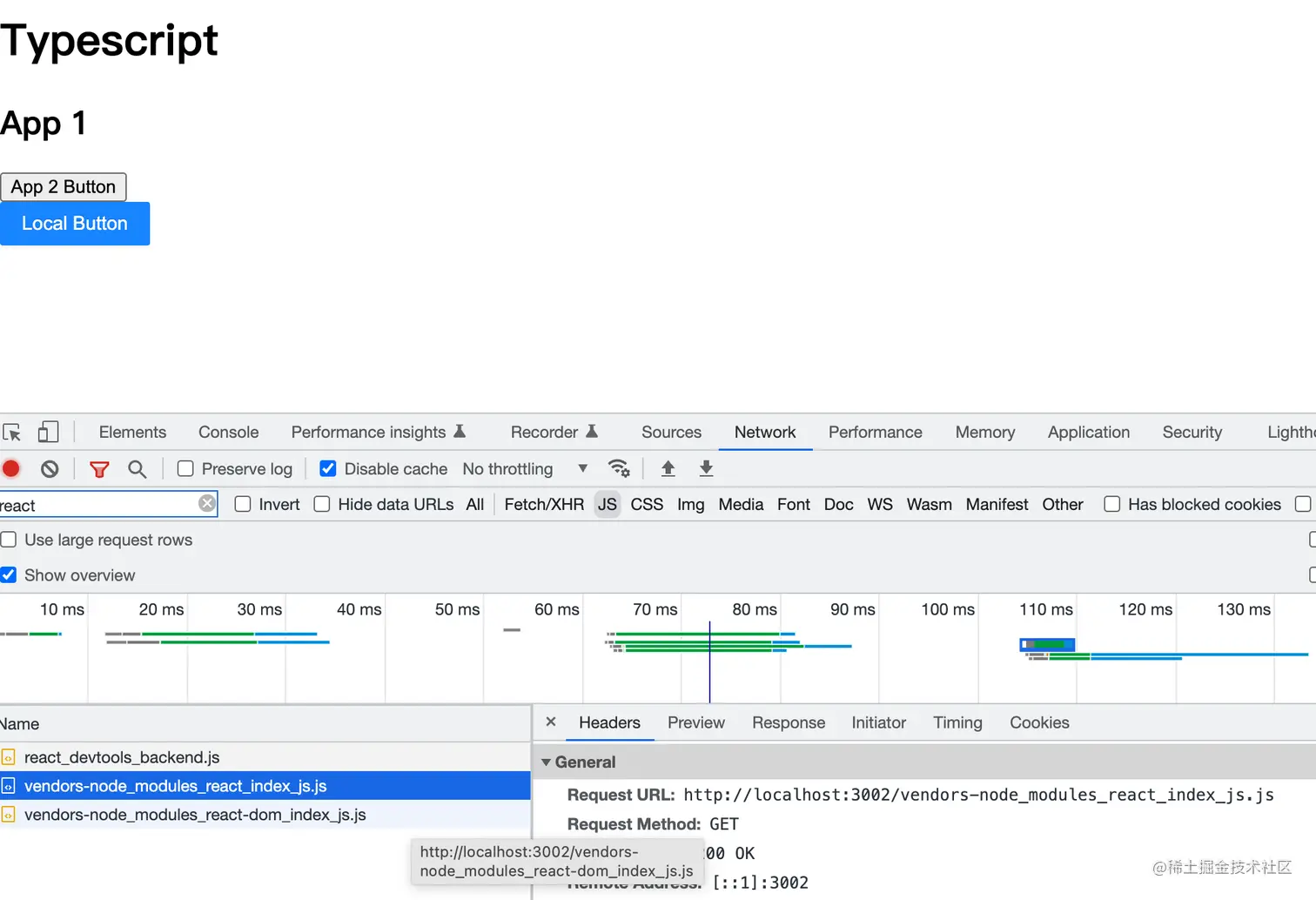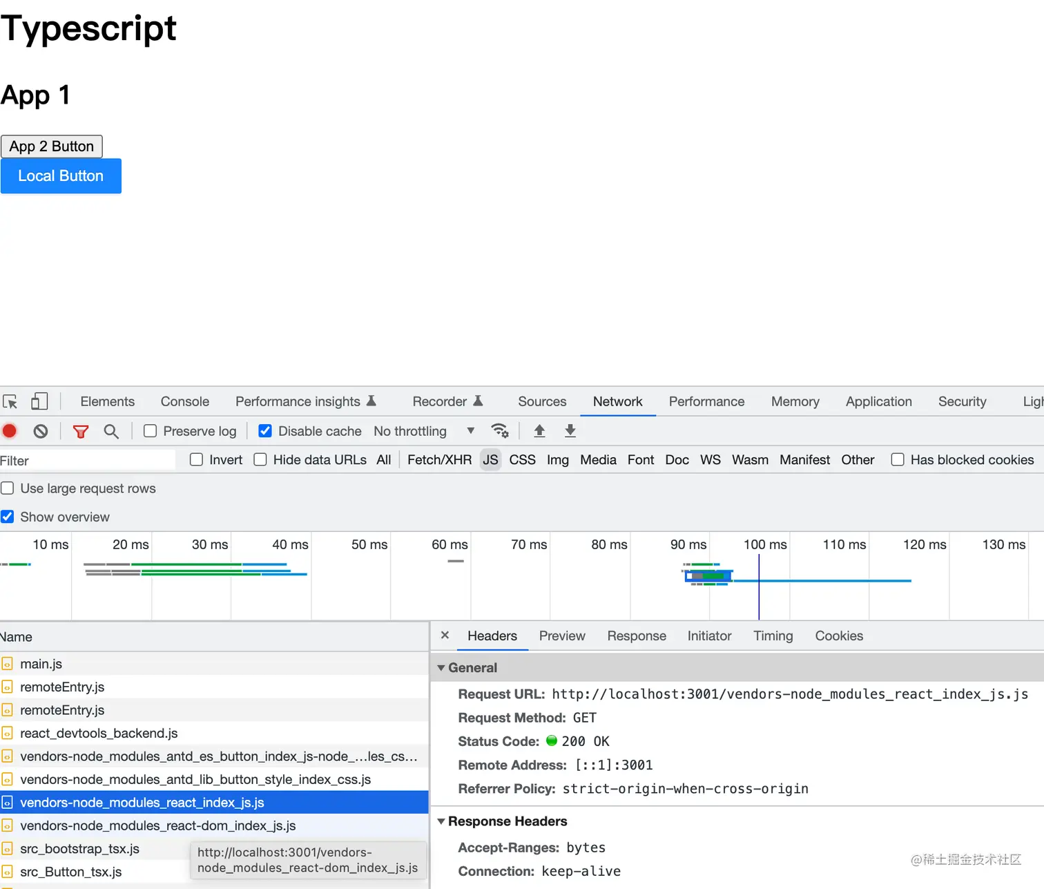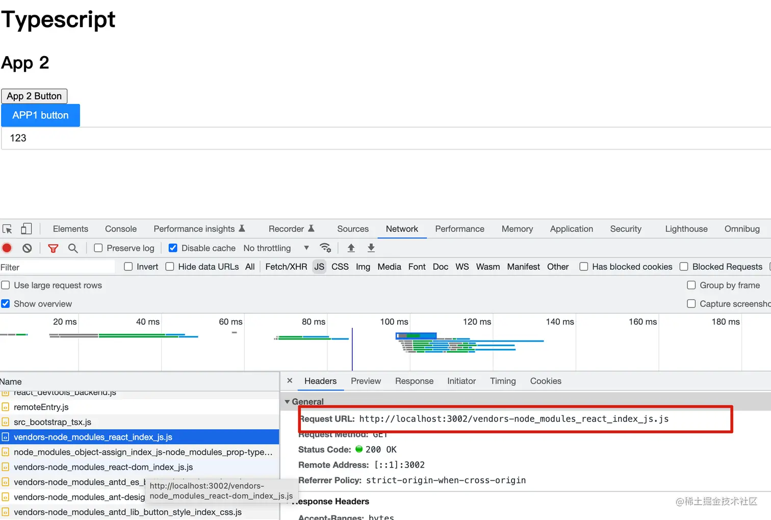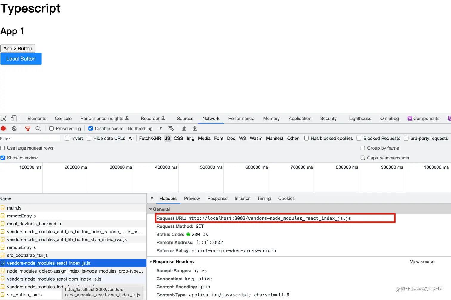 虽然前面其本身也导入了 react,但是我们知道 import其本身只是一种静态引用,其实真正渲染后面的组件时才会有 js chunk 请求的发起。而引用 RemoteButton 则是更前置的逻辑,而 RemoteButton 依赖了 react,所以导致这个例子中加载的是 app2 的 react chunk。为了验证我的猜想,我延后 RemoteButton 的加载: