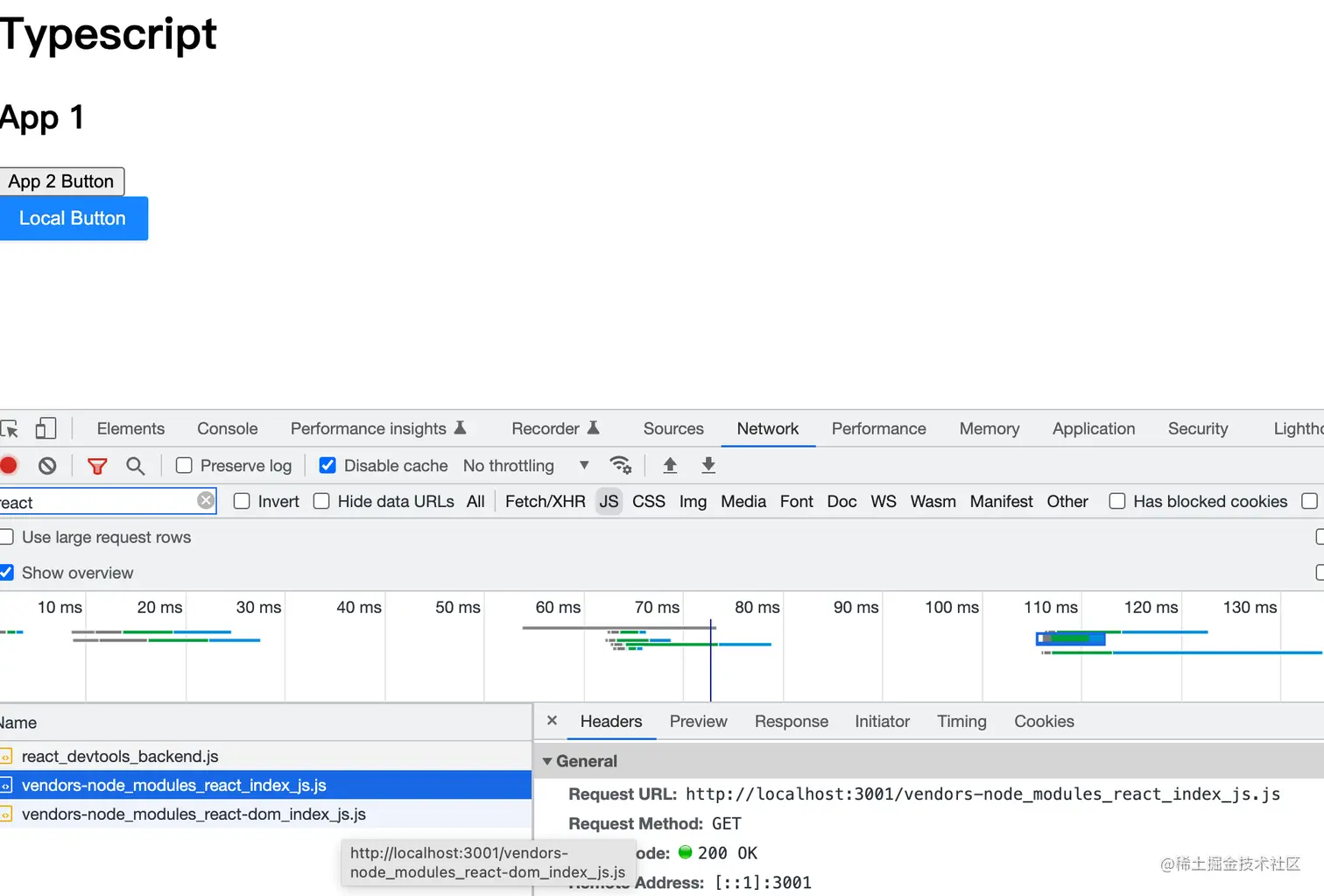 然后访问 app1 的应用页面,查看 react 和 react-dom 加载的路径: