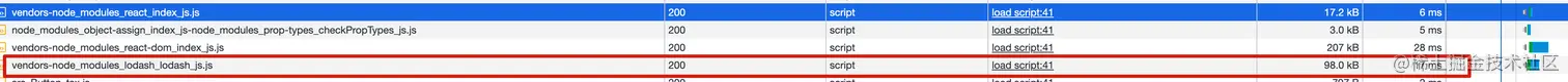 以上面的 app1 为例,我们在 app1 的 utils中使用了两个 lodash方法,然后在 App.tsx 调用,在加载 app1 的 js 资源的时候,我们发现,network 中加载了整个 lodash.js: