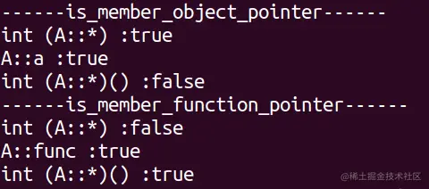 is_member_object_pointer/is_member_function_pointer分别识别成员变量指针,成员函数指针,成员指针实际上是不完整的指针,只记录了偏移地址,在具体使用时还需要配合实际的对象进行调用。