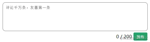 <div class="pinlun"> <textarea placeholder="评论千万条,友善第一条" id="area" cols="30" rows="10" maxlength="200"></textarea> <div> <span class="count">0</span> <span>/</span> <span>200</span> <button>发布</button> </div> </div> -
