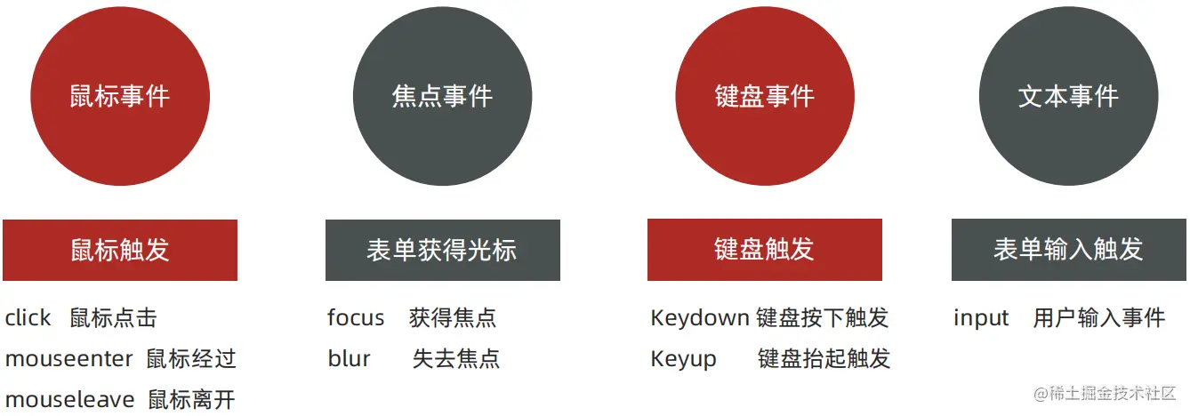 - 事件: 用什么方式触发,比如鼠标单击 click、鼠标经过 mouseover 等