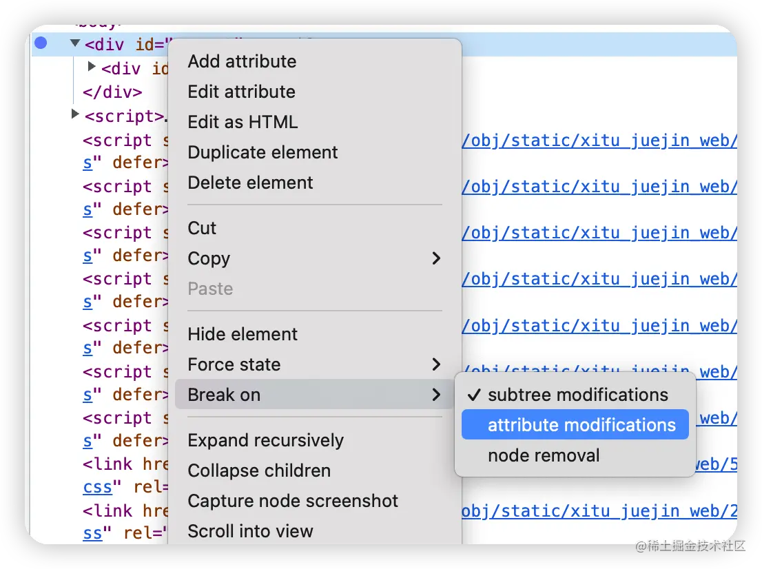 在标签上右键,选择Break on,可以选择子树修改、属性修改、节点移除三种断点方式。当js修改该dom节点时,就会断点在修改的位置。可以查看到哪些代码改变了dom。