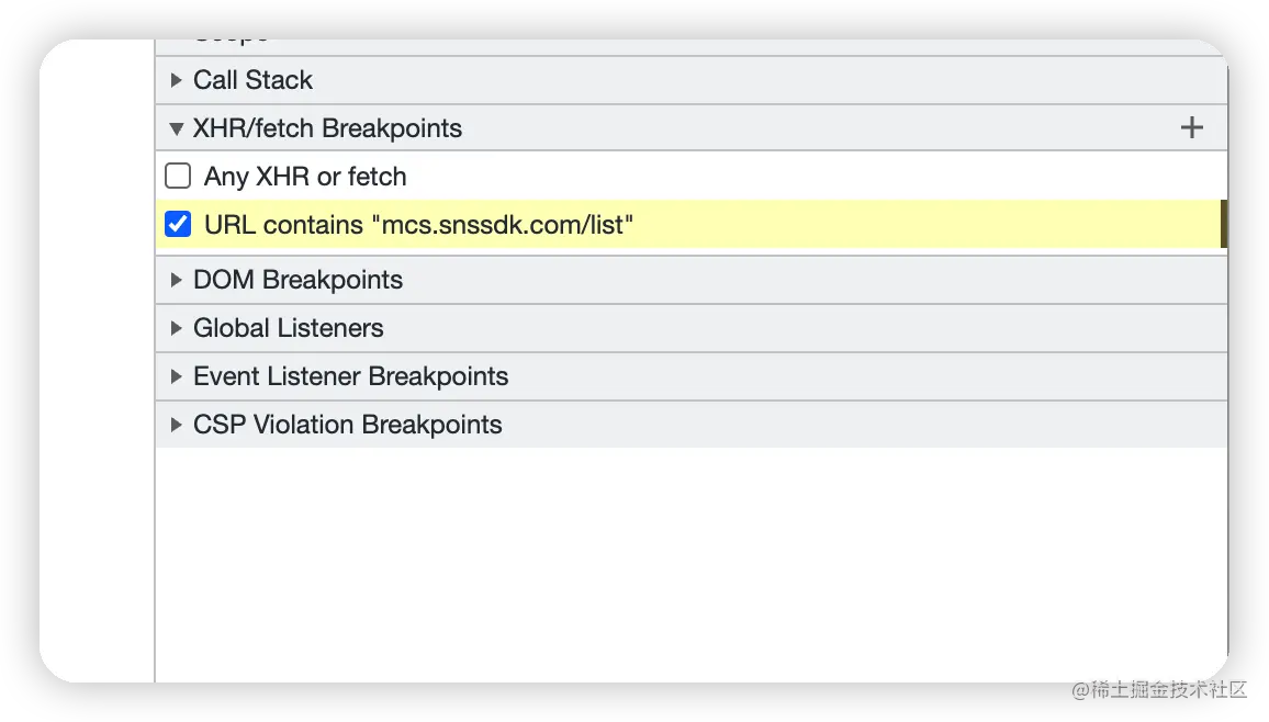 在XHR/fetch Breakpoints下,点击右边的+号,即可添加断点的url。一旦发起请求,就会断点在请求位置。但是一般请求的发起都是经过封装的,要定位到发起请求的业务代码的位置的话,可以通过调用栈callStack去追溯。