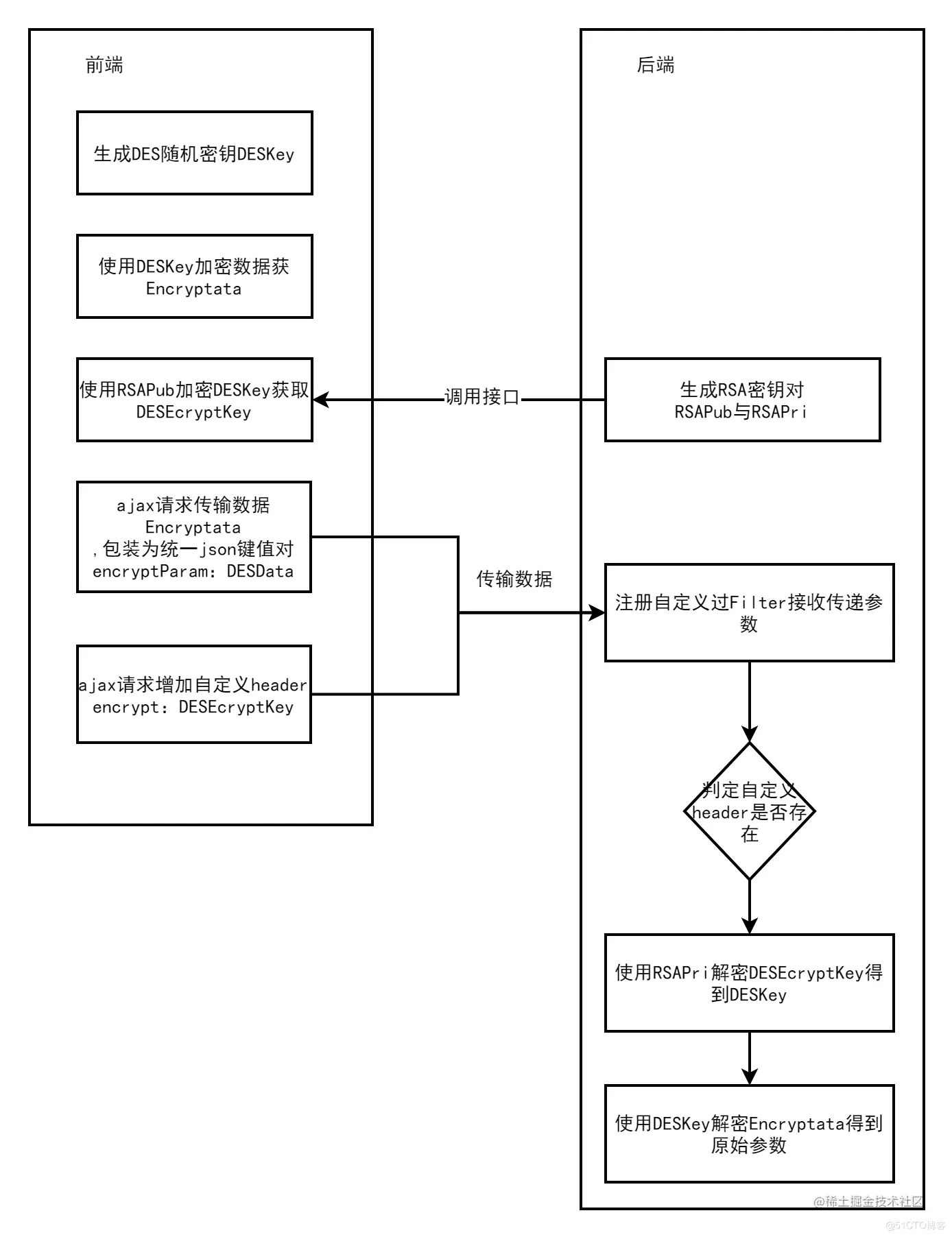 近期在对开发框架安全策略方面进行升级优化,提供一些通用场景的解决方案,本文针对前后端数据传输加密进行简单的分享,处理流程设计如下图所示,本加密方法对原有项目兼容性较好,只需要更换封装好的加密Ajax请求方法,后端统一拦截判断是否需要解密即可