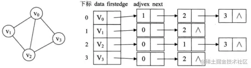 从图中可以看出,顶点表的各个结点由data和firstedge两个域表示,data是数据域,存储顶点的信息,firstedge是指针域,指向边表的第一个结点,即此顶点的第一个邻接点。边表结点由adjvex和next两个域组成。adjvex是邻接点域,存储某顶点的邻接点在顶点表中的下标,next则存储指向边表中下一个结点的指针。