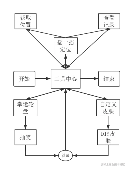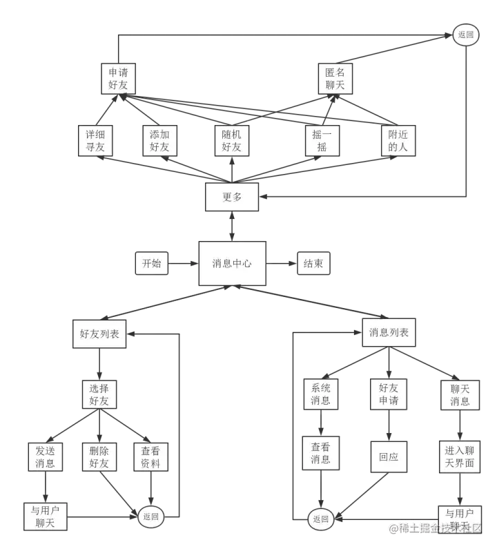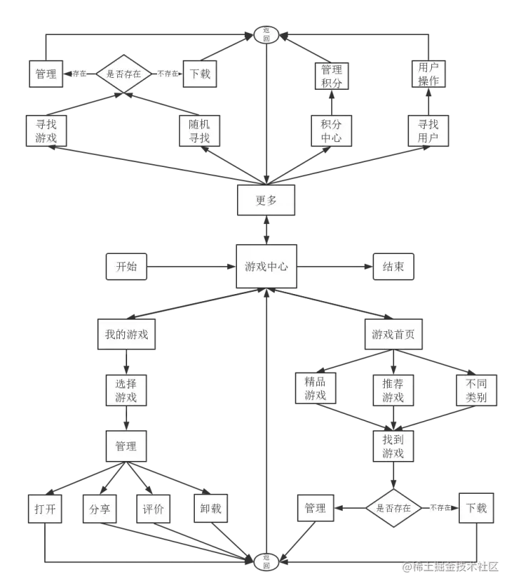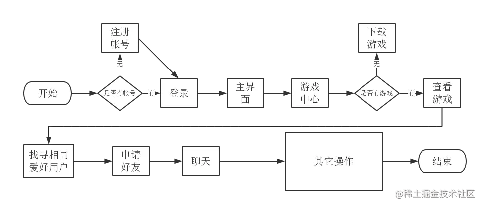 游戏的定位为游戏与社交,整体测试就是用户使用软件的流程测试,软件运行的主体流程如图5.2.1所示.