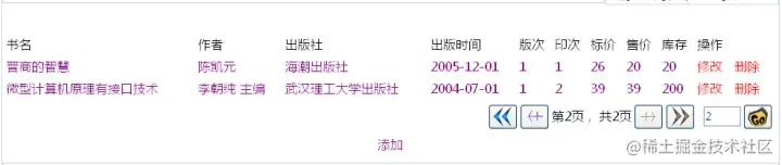 <% Conn con=null; try { String comSql=""; if(request.getParameter("sort")!=null) comSql+=sql+" and bookCommend='inSort'"; else comSql+=sql+" where bookCommend='inAll'"; comSql+=" order by bookSold desc"; con=new Conn(); Pageable rsCom=con.getRs(comSql); rsCom.setPageSize(10); rsCom.gotoPage(1); for(int i=0;i<rsCom.getPageRowsCount();i++) { if(sort==null) { %> <ahref='index-main.jsp?sort=<%=rsCom.getString("bookSort") %>'>[<%=rsCom.getString("bookSort") %>] <% } %> <ahref='book-information.jsp?id=<%=rsCom.getString("bookId") %>'><%=rsCom.getString("bookTitle")%> <%=rsCom.getString("bookAuthor")%> <%=rsCom.getString("bookDate").substring(0,10) %> <% rsCom.next(); } con.closeRs(); }catch(Exception e) { out.print(e.toString()); } %> |