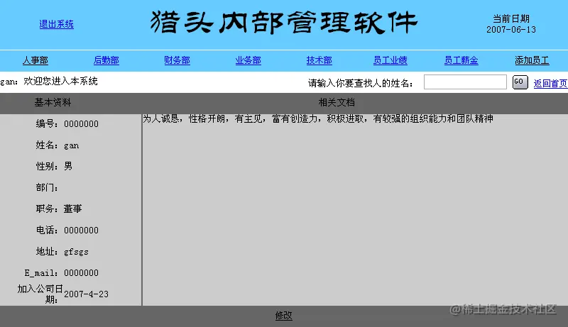 查询模块是方便公司员工查询其他员工的一些资料而设计的,这也涉及到权限问题,一般员工的登录权限只能查询其他员工的公开资料,而管理层的登录权限不仅可以查询到公开资料,也能查询保密资料,这个功能是根据登录者的权限点击链接时,跳转到不同的显示页面来实现的。
