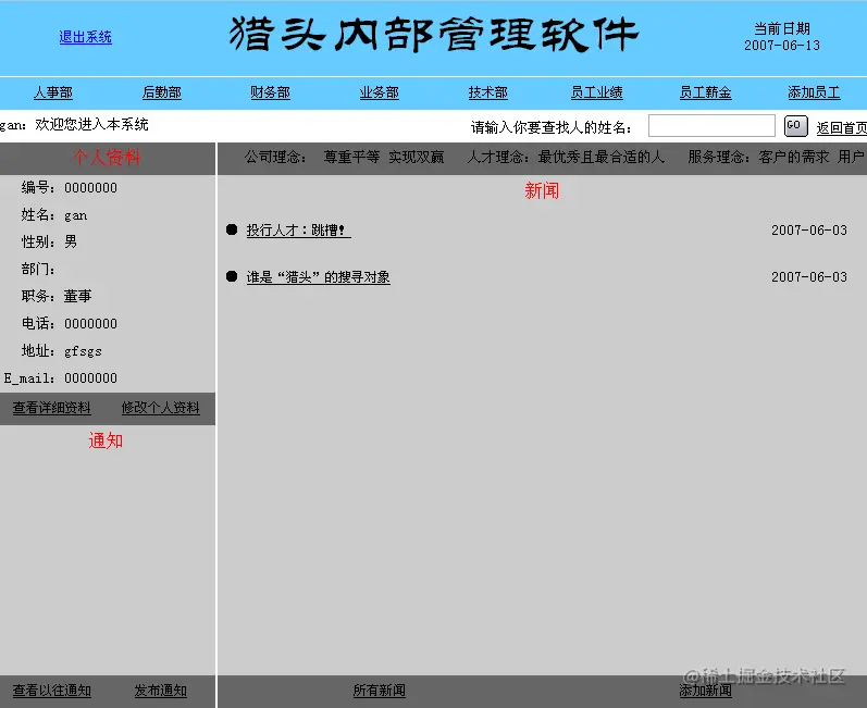 新闻通知是公司的新闻和一些诸如开会、比赛等的通知。所有员工都能看到这些数据,但只有公司的管理层才能对其操作。