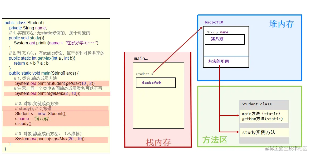 - 实例成员方法(无static修饰,归属于对象),只能用对象触发访问。