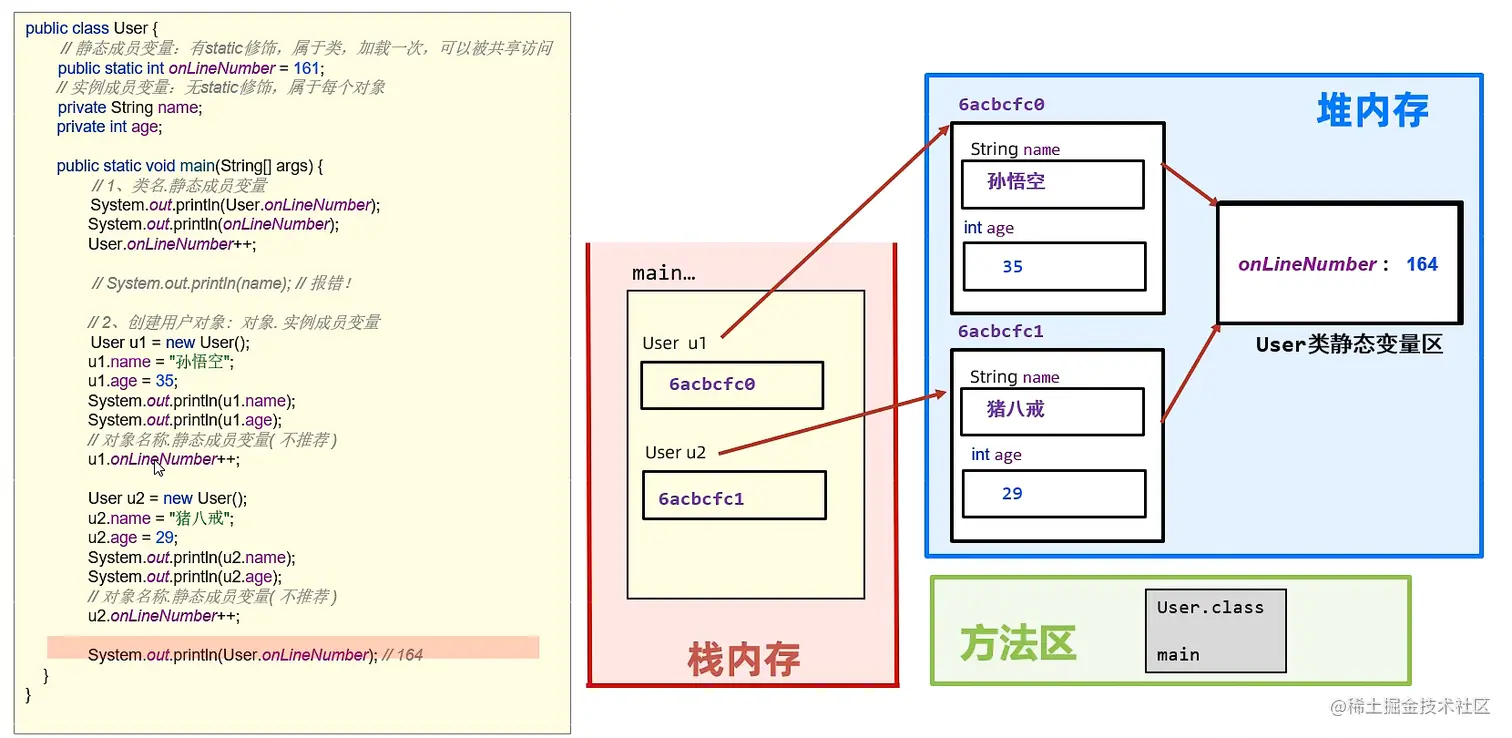 - static修饰成员变量之后称为静态成员变量(类变量),修饰方法之后称为静态方法(类方法)。