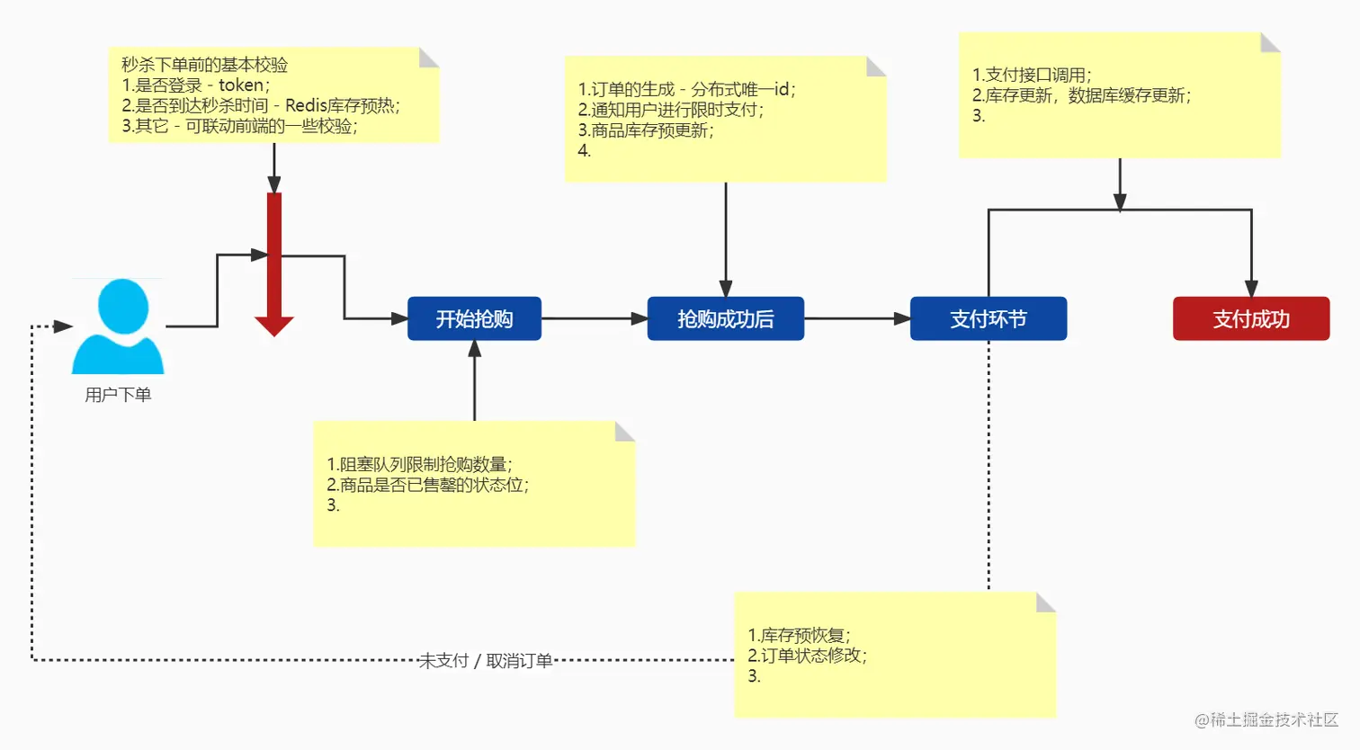 - 如未在规定时间内购买:库存恢复,队列释放,秒杀继续;