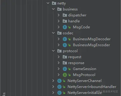 - 其中有三个大目录,business\codec\protocol,分别是业务包、编解码器、私定协议;