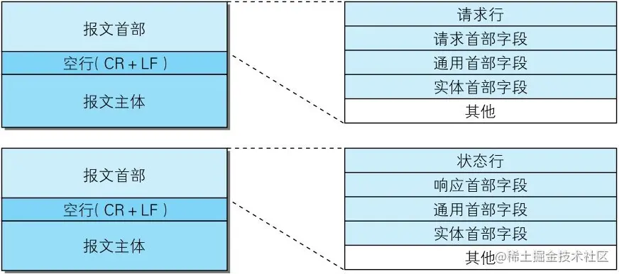 - 请求头:若干头部的字段,如消息正文长度、字符集等