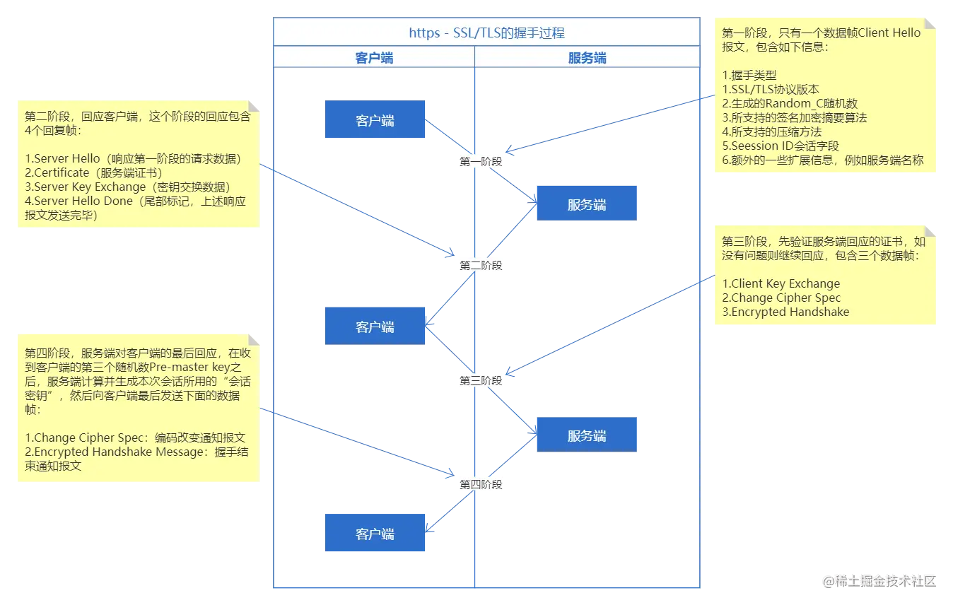 - 握手协议 用来在协商通信的过程中使用加密套件(加密算法、密钥交换算法和MAC算法等),在服务端和客户端之间安全地交换密钥、实现服务端和客户端的身份验证。