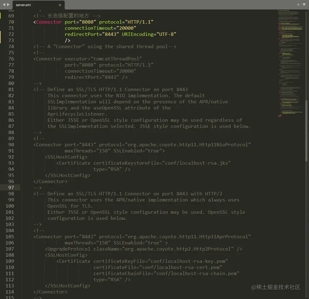修改apache-tomcat-8.5.69\conf\server.xml文件中的Connector(连接器)的配置,死命写参数