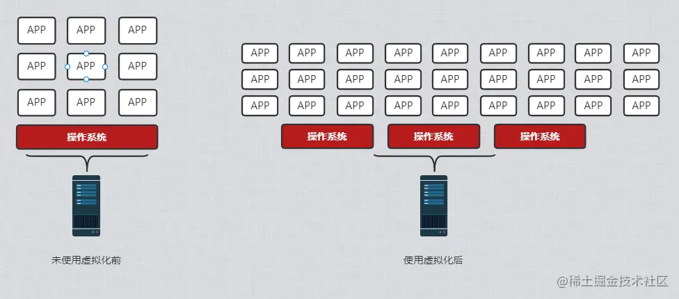 在使用了虚拟化后,可以通过虚拟化产出的虚拟机之上构建操作系统及应用。