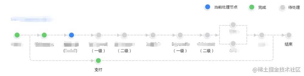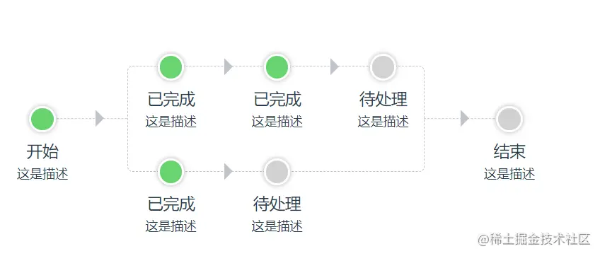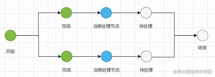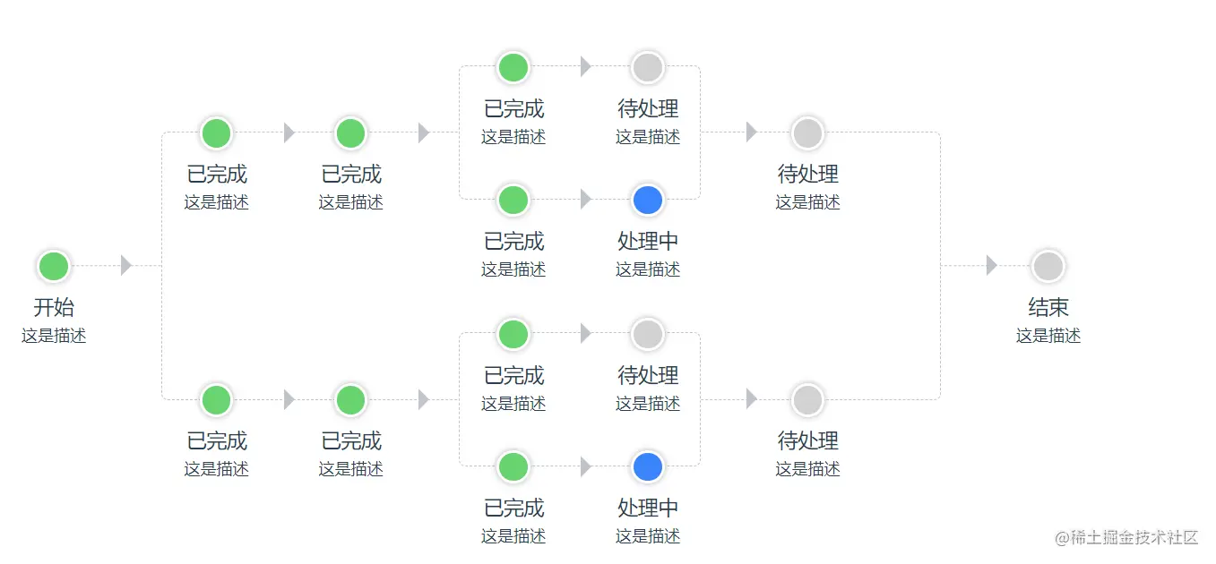 data = [ {status: 'completed' , name: '开始' }, [ // 1. 这个数组表示是并行节点 [ // 1.1 这个数组表示是并行节点中,上边 串行节点的数据 {status: 'completed' , name: '完成' }, {status: 'processing' , name: '当前处理节点' }, {status: 'pending' , name: '待处理' } ], [ // 1.2 这个数组表示是并行节点中,下边 串行节点的数据 {status: 'completed' , name: '完成' }, {status: 'processing' , name: '当前处理节点' }, {status: 'pending' , name: '待处理' } ] ], {status: 'pending' , name: '结束' }, ]
