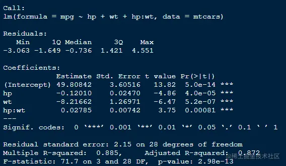 fit <- lm(mpg ~ hp+wt+hp:wt,data = mtcars)