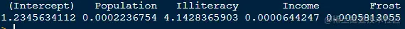 这里为了简化问题,我们只取四个指标进行回归分析:population、illiteracy、income、frost