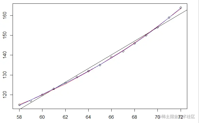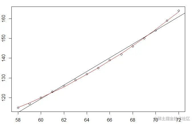 这次使用lines()函数,这个函数能把点连成线,横坐标是身高数据,纵坐标是根据拟合模型的得出的预测值,为了增加比较的差异性,我们给第二个曲线增加颜色: