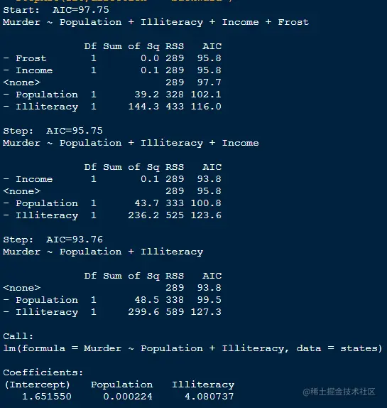 首先我们将state.x77这个矩阵数据转化成数据框,因为lm()函数输入数据必须是数据框的格式