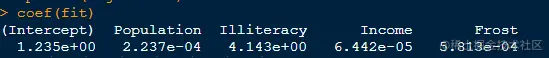 我们可以使用coef()函数单独查看各项的系数,根据系数项和截距值就能写出拟合方程