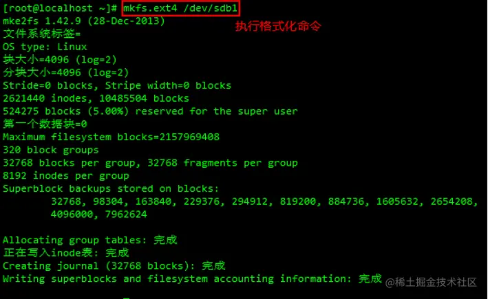 1.使用命令:mkfs.ext4 /dev/sdb1(ext4为磁盘格式化的格式)对分区磁盘进行格式化。