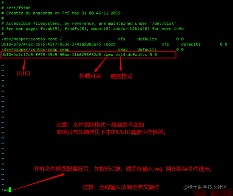 /dev/sdb1: UUID="4d2c17d5-ff75-45e5-90ba-11b0255f32d5" TYPE="ext4" //修改前UUID=4d2c17d5-ff75-45e5-90ba-11b0255f32d5 /www ext4 defaults 0 0 //修改后