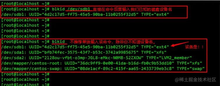 这里推荐使用blkid /dev/sdb1(blkid 设备名),精确点也少点调试错误。