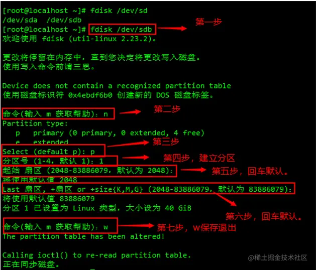 2.对磁盘进行分区,使用命令:fdisk /dev/sdb 对新增磁盘进行分区(/dev/sdb为新增数据盘标识)