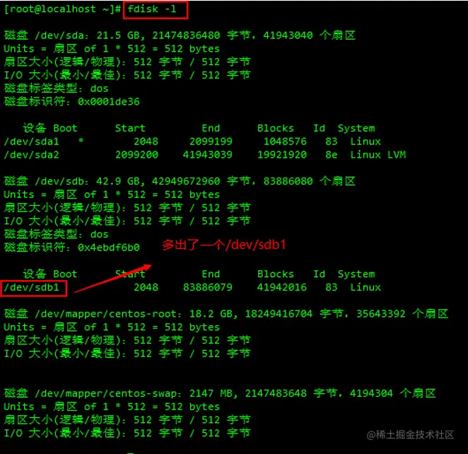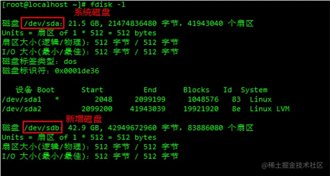 1.使用命令:fdisk -l 查看磁盘(注:正常在Centos7中第一块数据盘标识一般是/dev/sda,第二块数据盘标识一般是/dev/sdb)