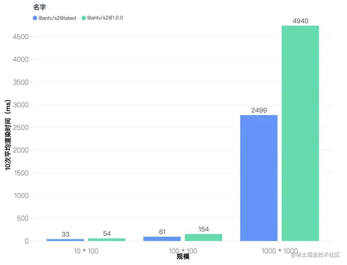 虽然 S2 1.0 已经能扛住 100w 海量数据的考验,但极致的性能体验一直是我们的首要追求。今年继续针对性能开启专项,从数据加工到渲染全链路层层优化,最终,表格的渲染速度相较 1.0 版本得到了约 2 倍 提升:
