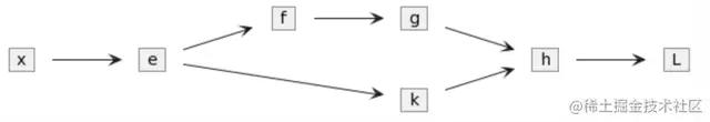 对于节点h来说,它需要把梯度传给g和k。对节点e来说,它需要对f和k传来的梯度求和,才是∂L/∂e。这样,L对x的梯度,仍可以按链路拆解,一条链路前后节点间的梯度是乘积关系,传入的多条链路梯度是加和关系。