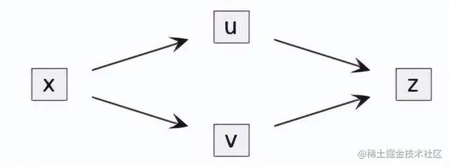 根据这个公式可以知道,z对x的梯度分别沿两条链路传播,z -> u -> x和z -> v -> x,节点x将两个梯度之和作为z对x的梯度。