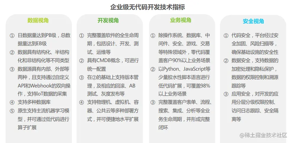 软件开发进入到全员创新新阶段,无代码平台成为主要载体 随着IT技术的成熟,现阶段软件工程领域已经积累了足够的能力和知识去进行抽象和复用。无代码开发平台屏蔽了复杂的 代码环节,没有IT基础的用户只要花费少量的时间学习软件搭建的逻辑,即可上手进行软件的开发。“开发者”的范畴被 扩大到全民(IT人员、业务人员、管理人员、学生等),他们丰富的背景为软件创新注入了新的活力。政产学研结合成为 全员创新时代的最佳推广模式:政府引导社会接纳新技术工具的同时提升当地的生产力,厂商进行自身能力输出的同时为 自己储备了新生力量,学校通过软件工程实训课等模式与厂商合作的同时提升了自己的教学研究质量。我们期待在各方因 素的齐心协力下,新生产力工具——企业级无代码带来产业的新变革!