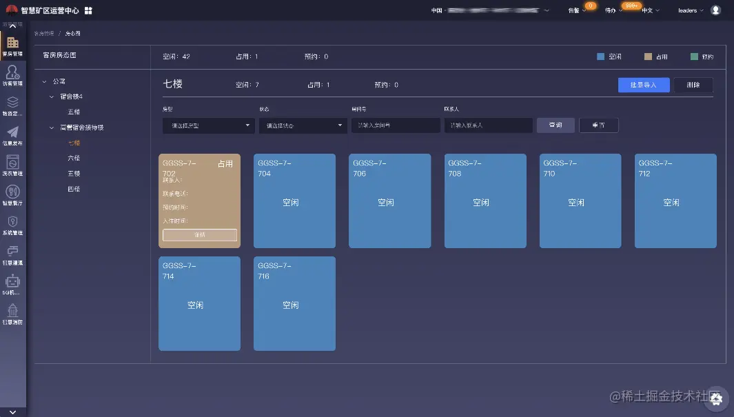 为了对矿区进行精细化管理,辅助实现高效安全的生产和运营,在矿区的综合态势方面,万洲嘉智基于低代码平台,集成园区安防、设备、通行、环境、餐厅、客房等数据,进行数据大屏的一屏展示,多维度态势分析,一屏掌握园区实时状况。