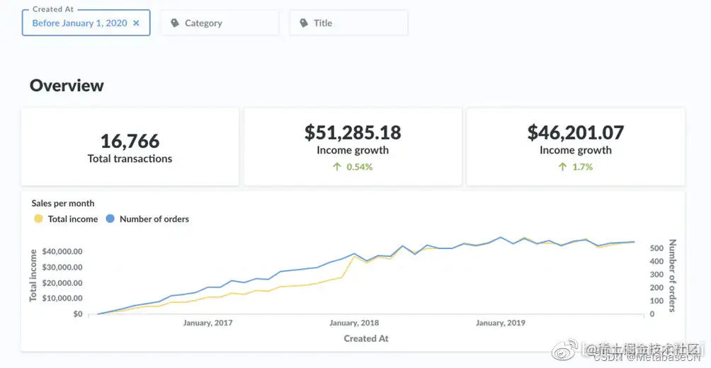 图2。使用Metabase中包含的示例数据库中的数据的筛选器小部件的示例仪表板。