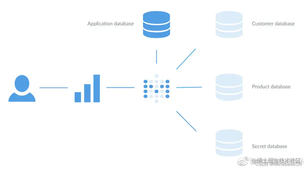 图1。连接到多个数据库及其应用程序数据库的单个Metabase实例,该数据库存储问题、仪表板和其他特定于Metabase的数据。随着增长,可以轻松添加更多Metabase实例。