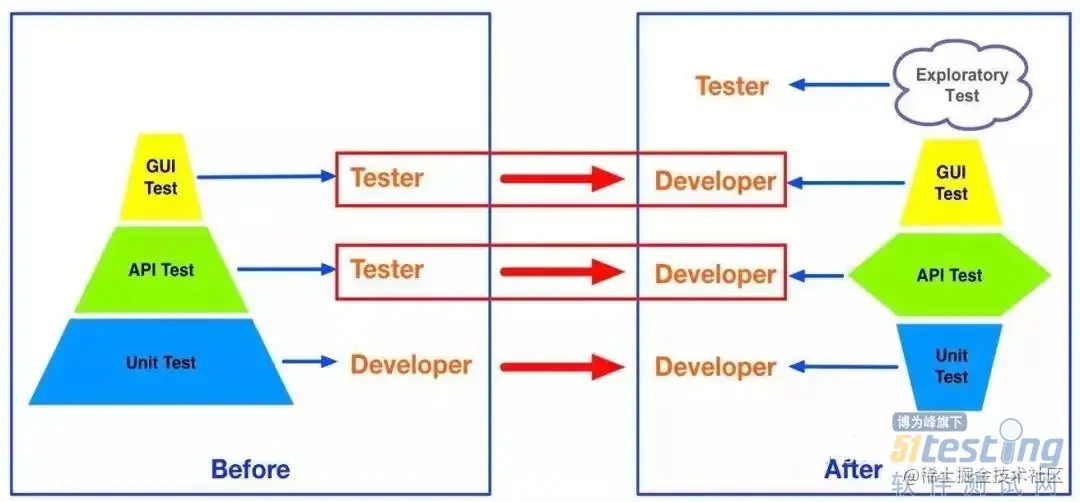 面对这样一个大的变革,你可以看到有点类似于把测试上移了,就是你原来的测试工程师只是做上面的 ET 部分,但是原来的那些像下面的 API 测试,或者 UT,或者基于 UI 测试,这些测试谁做呢?由开发做,但是由开发做不表示这个活没有,测试这个活还是在的,只不过是换了一批人去做这个事情,本质上并没有根本性的变化。根本性的变化就在于可能从组织架构的角度来看,现在可能不再有集中的一个测试团队了,这些负责测试业务的测试工程师会打散到各个开发团队里面去,而且他承担的角色也不一定是全职的测试,他有可能会做一部分开发,也会去做一部分的测试。