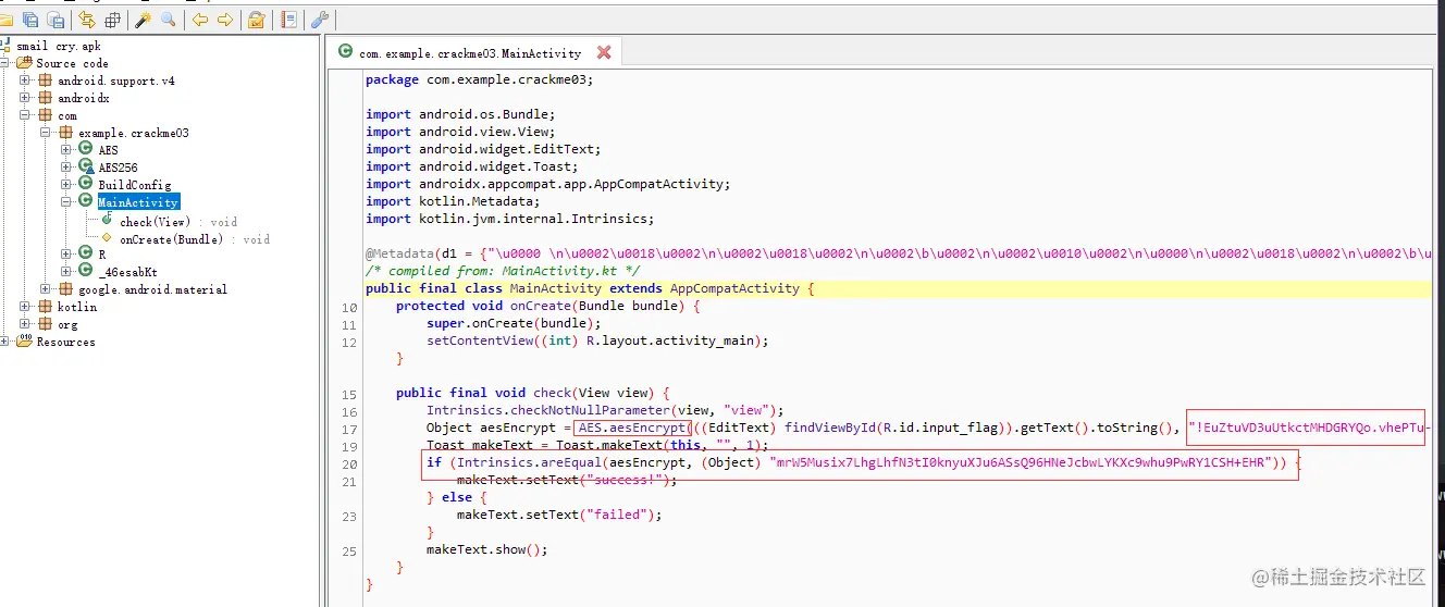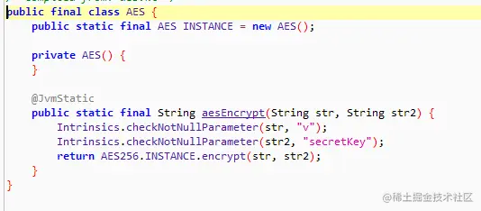 可以看到是AES加密,后面传入的参数,应该就是key,在下面的 if 语句中可以看到最后加密完成的密文。